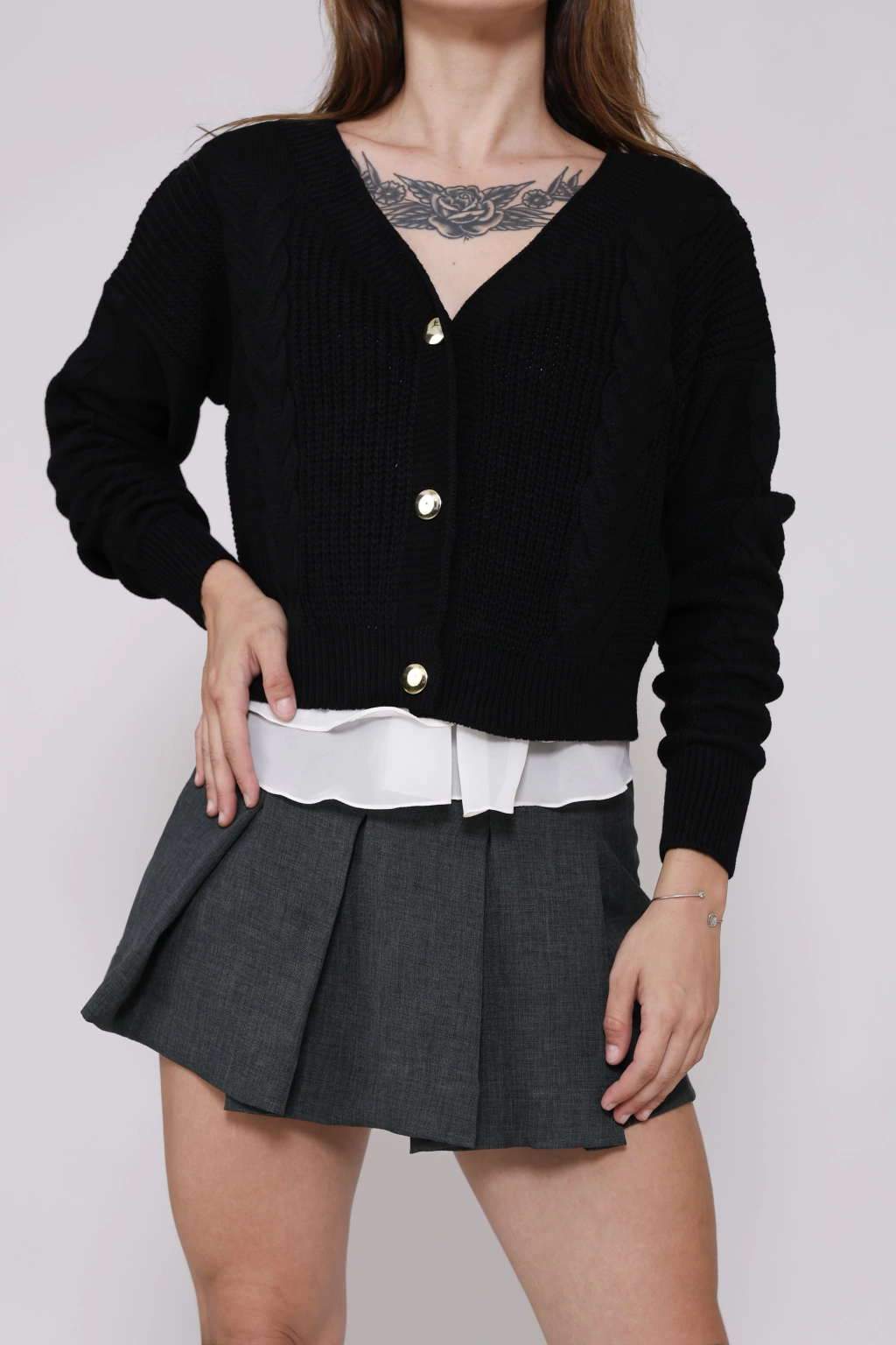 Cardigan de manga longa confeccionado em tricot. Adaptável ao corpo, fecha com botões. Possui detalhe trançado na parte da frente.