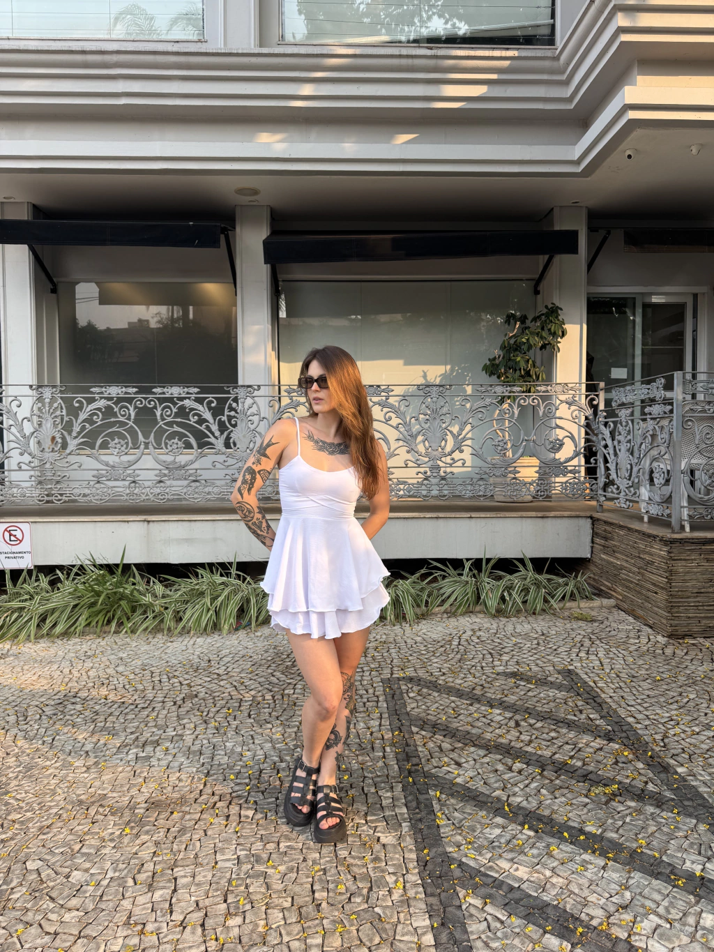 Macaquinho com modelagem godê que parece um vestido de tão soltinho que é. Possui saia com babados sobreposta ao short, zíper invisível que abre bastante para vestir com mais conforto, alcinhas fininhas com regulador e busto duplo pra não ficar transparente. Fabricante: studio belissa