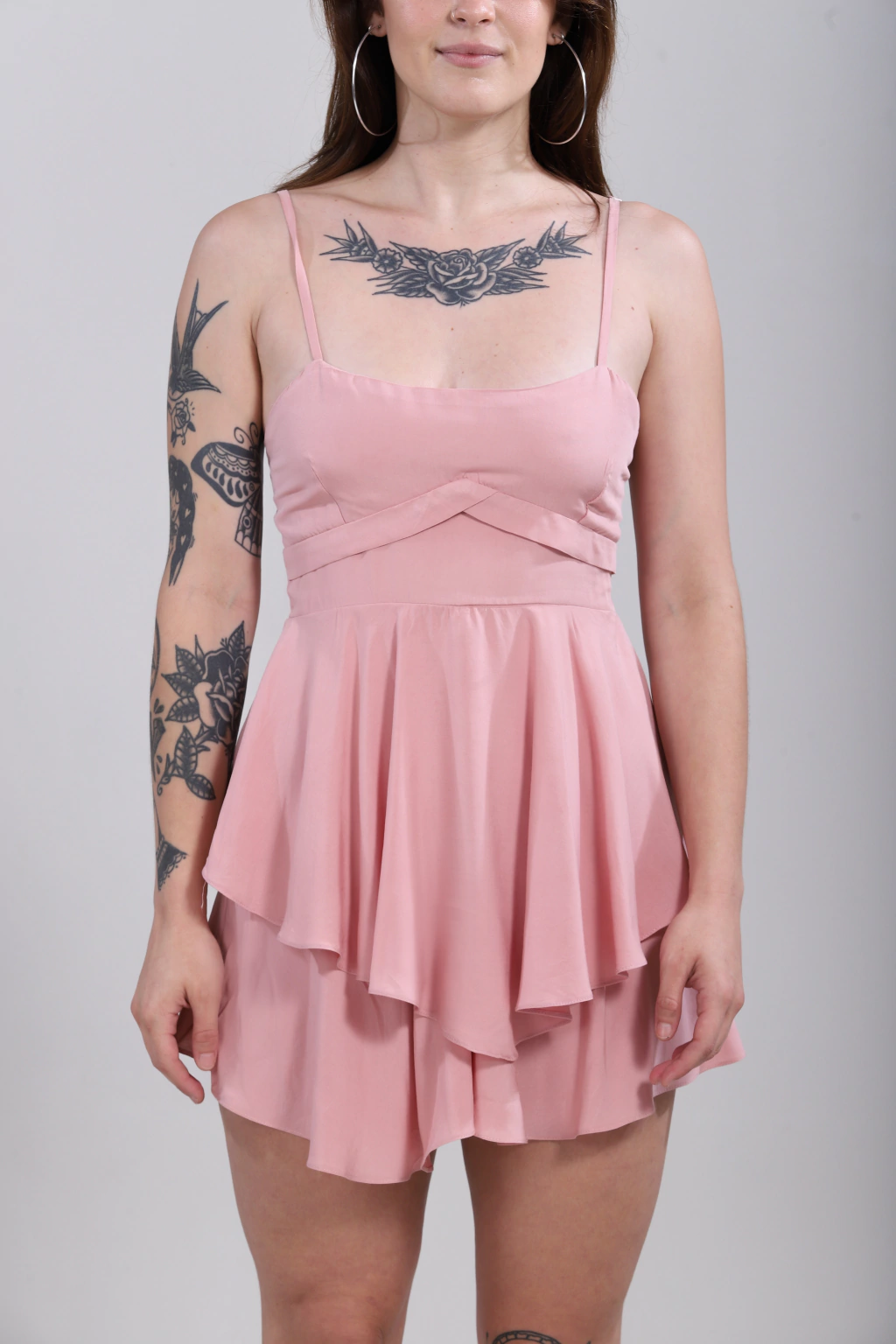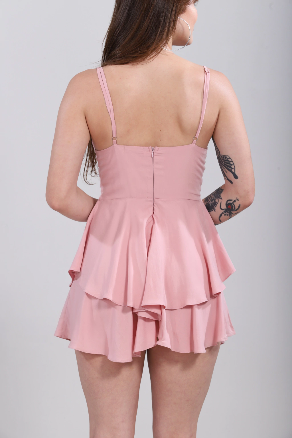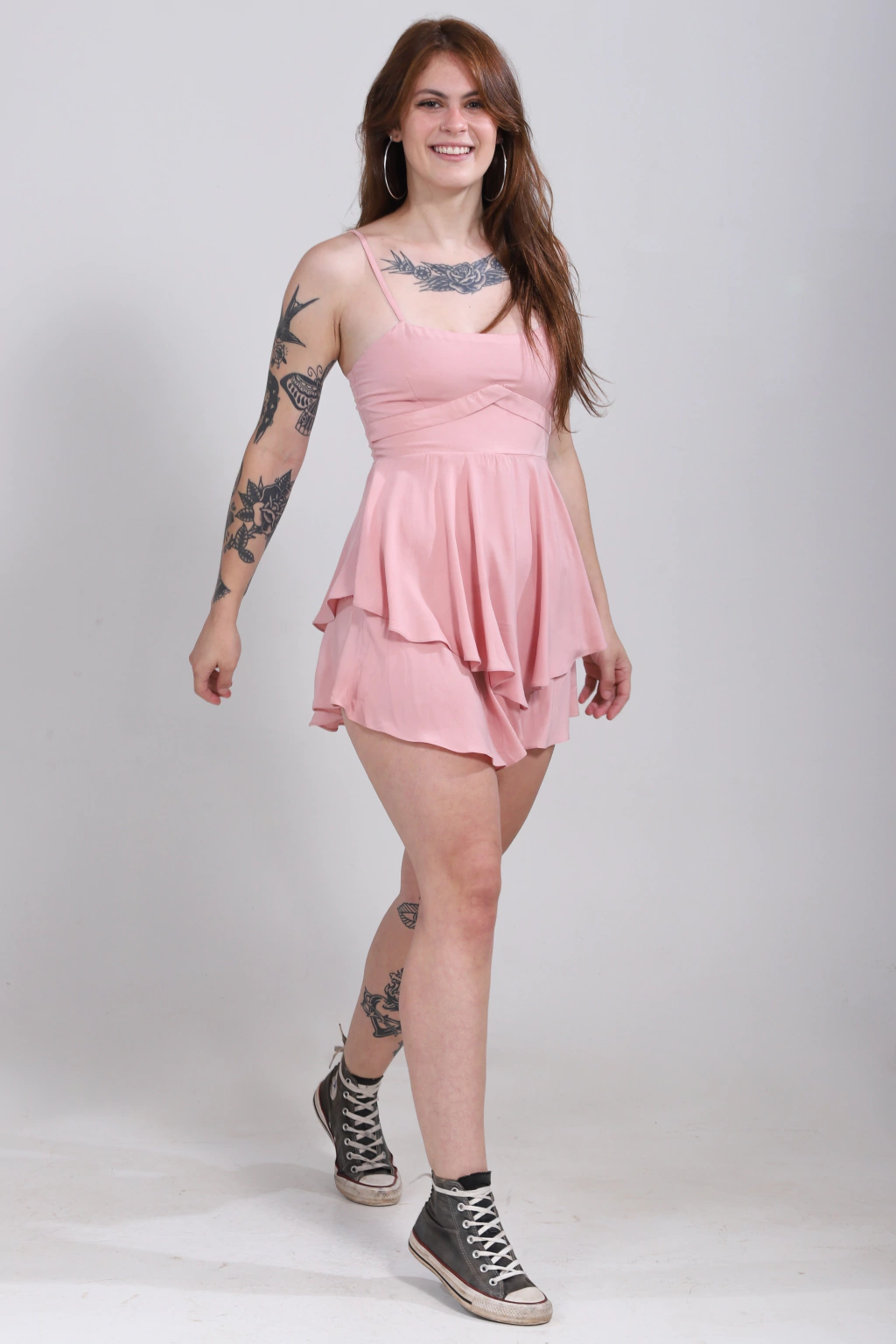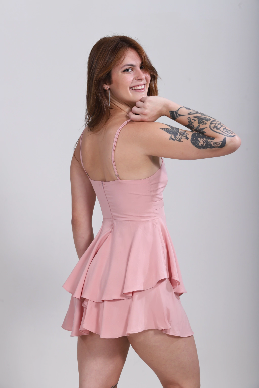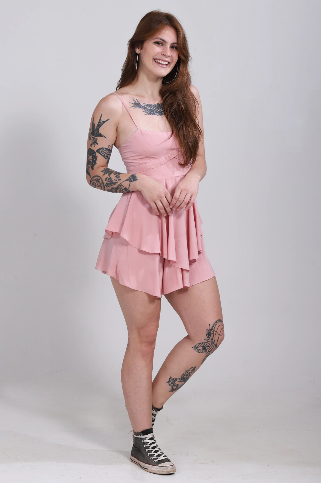 Macaquinho com modelagem godê que parece um vestido de tão soltinho que é. Possui saia com babados sobreposta ao short, zíper invisível que abre bastante para vestir com mais conforto, alcinhas fininhas com regulador e busto duplo pra não ficar transparente. Fabricante: studio belissa