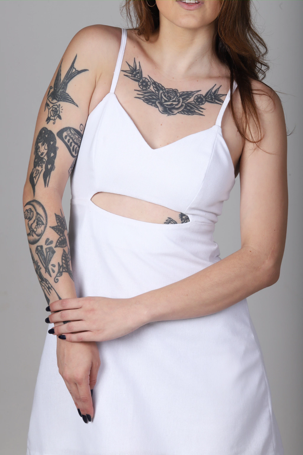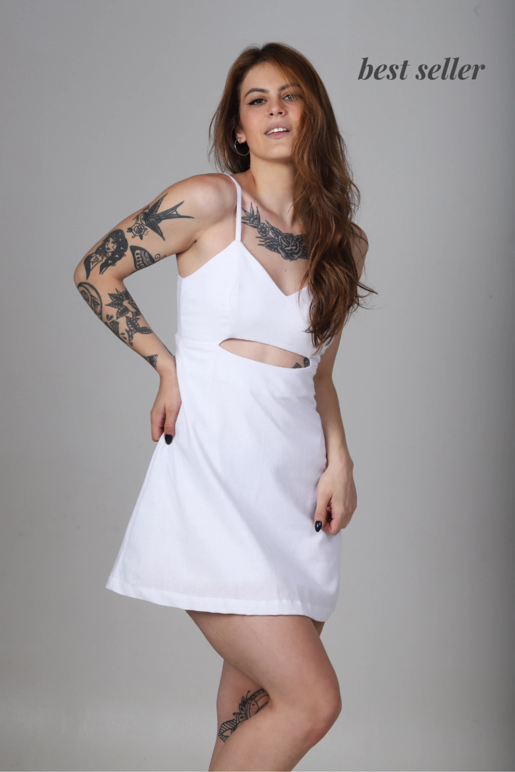 Vestido curto com modelagem evasê e fenda frontal abaixo do busto. Possui busto estruturado e duplo, alcinhas fininhas com regulador e é inteiro forrado. Pensando na sua comodidade, fizemos essa peça com dois dedos de barra, para caso você opte por desfazê-la para aumentar um pouco o comprimento. Fabricante: studio belissa